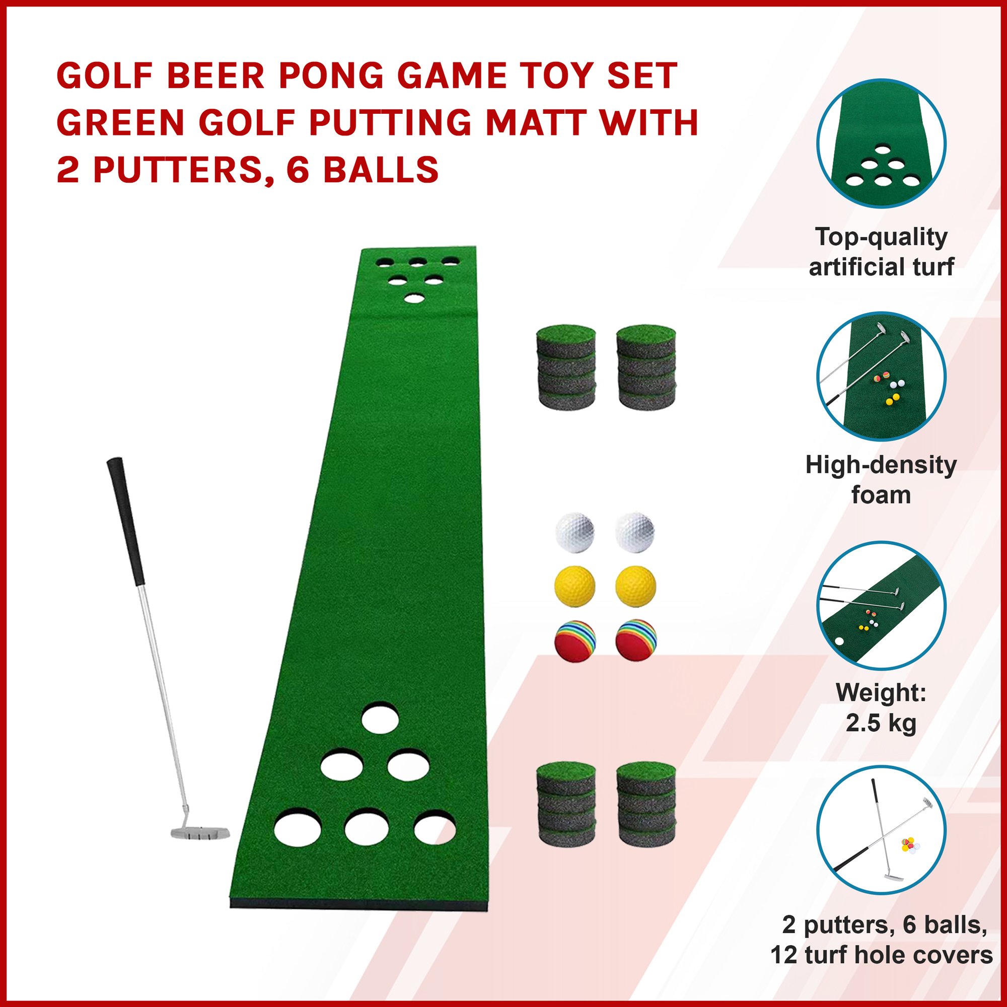Golf Beer Pong Game Toy Set Green Golf Putting Matt with 2 Putters, 6 Balls