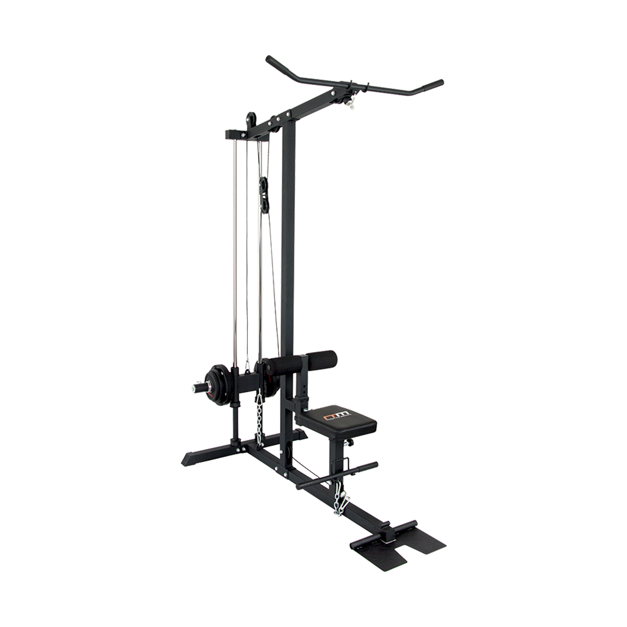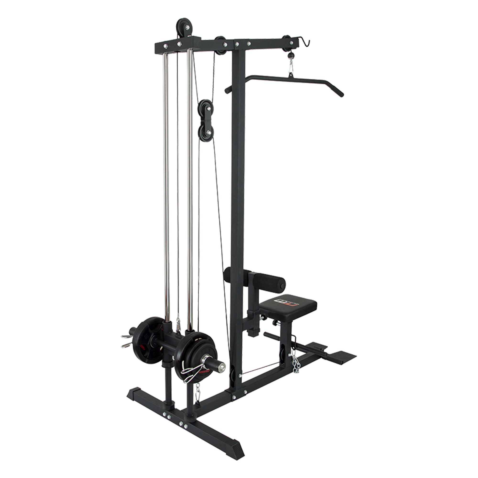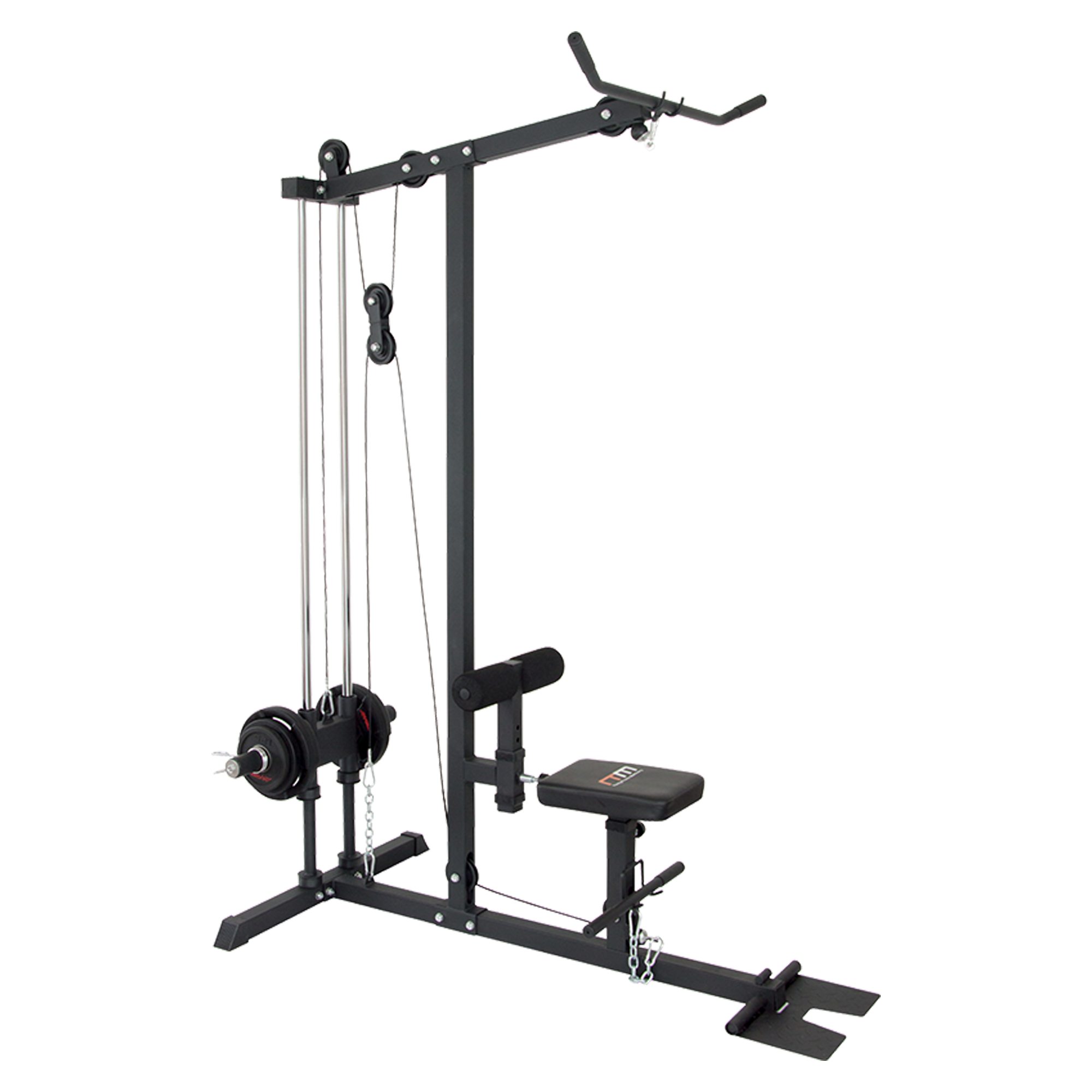 This new Fitness Plate Loaded Low Row / Lat Pull has a heavy duty steel construction. The solid unit has a dual guide rod system which provides the ultimate in safe, smooth and easy range of motion. The foot plate can be quickly flipped up in place for low rows. Lat Pull Down, Straight Row Bar and Standard and Olympic Weight Plate Adapters are included. Its “no cable change” design allows for easy adjustment from lat pull down to low rows.