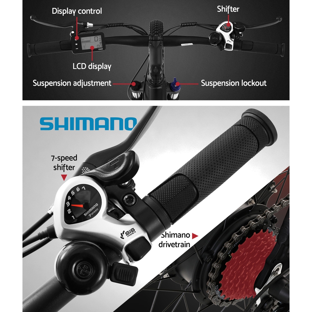 For effortless riding, look no further than our VECOCRAFT Electric Bike. With its 36W 10Ah lithium battery, this astounding electric bike can really go places with as far as between 60km and 70km on a single charge. The ever-dependable 250W brushless motor can deliver a maximum street-legal speed of up to 25km/h for every cycling activity. Built to last, the bicycle features an aluminium alloy frame that is lightweight and yet strong and sturdy. Better still, the electric bicycle is also loaded with a host of useful features that makes riding it a pleasure. Such as the high-quality Shimano 7-speed shifter mated to large 27.5?? tyres for smoother cruising, thick cushioned seat for extra comfort, front and rear disc brakes for more effective braking and not least, front fork suspension that makes going over rough terrain a less jaw-juggling prospect. At the back, an LED headlight makes night riding as clear as day.
